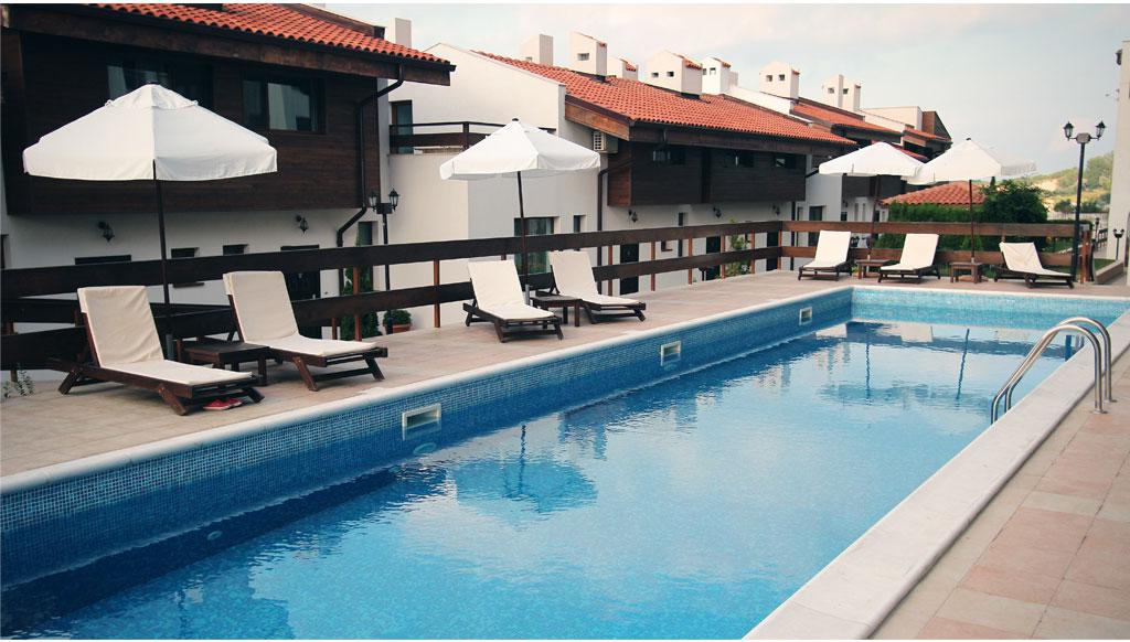 The silhouette of the complex beautifully fits into the picturesque landscapes. The elite close type complex is situated straight on the sea coast, sandy private beach separates the complex from the azure sea waves. The complex has harmonic forms, built up by natural high qualified materials. The white color, the panoramic landings, romantic terraces, cypresses and the tile roofs prevail in the design of the architectural ensemble.
