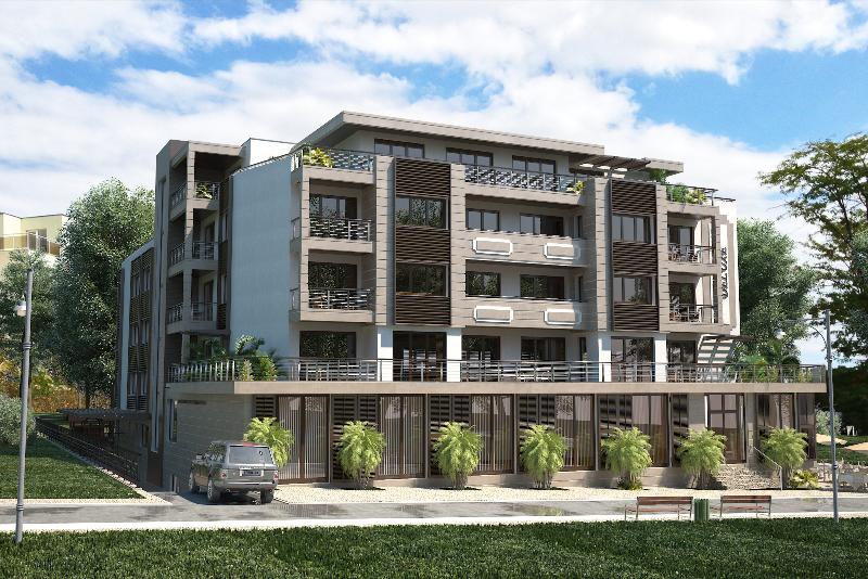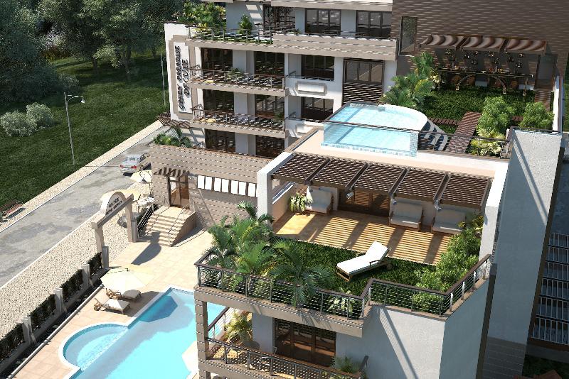 The complex features by reception, SPA center, fitness, underground garages, swimming pool with children section, covered relax area, children playground, security, video monitoring, and restaurant. The roof offers Jacuzzi and bar.